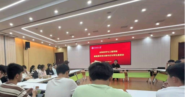 为了深刻了解学生的学习与生活状态,全面发挥党支部的帮扶功能。5月22日晚上,新能源系党支部书记王彬彬老师与新能源材料与器件专业2023级5、6班全体同学在学院1203多功能厅召开师生座谈会。