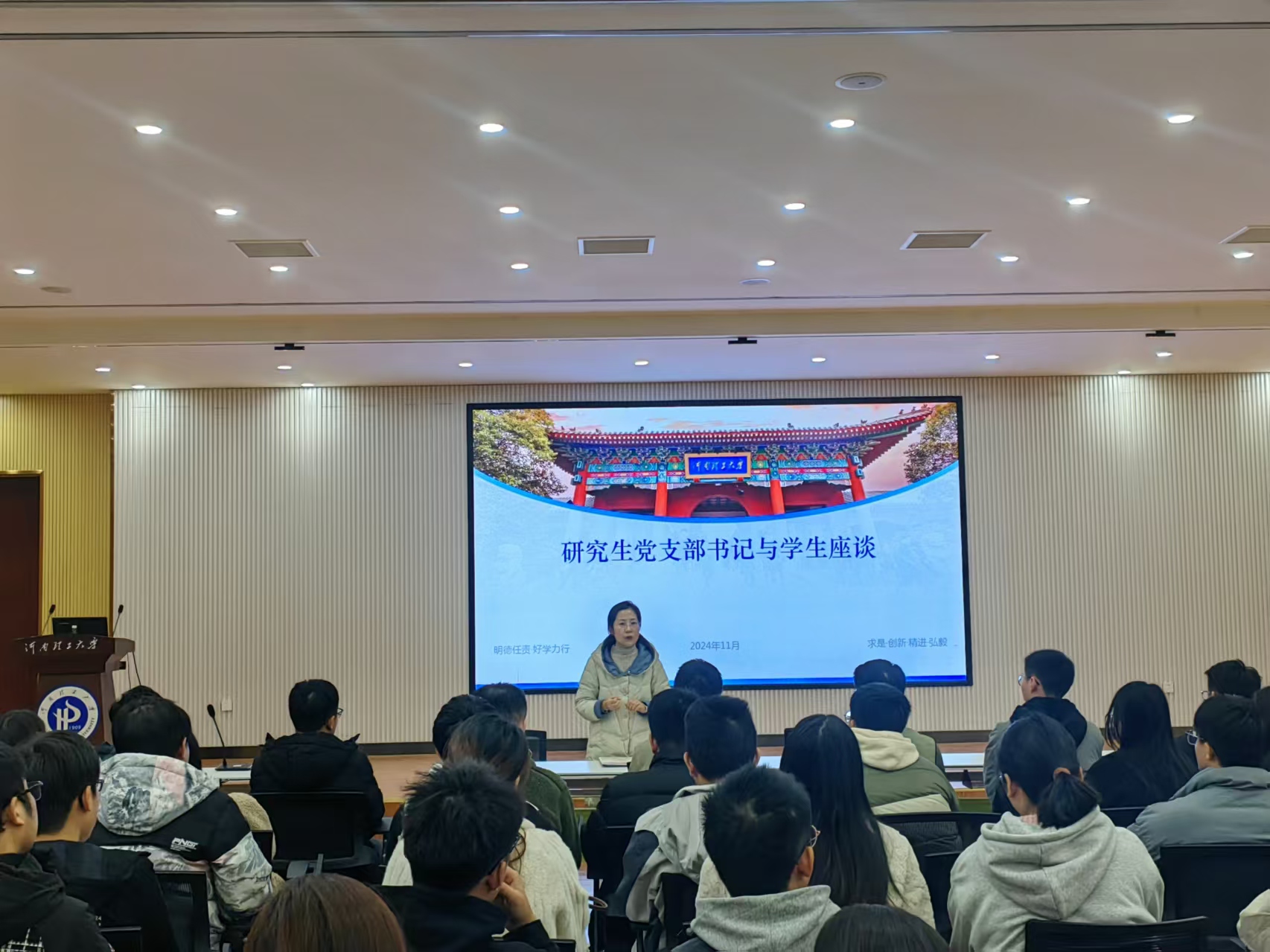 为及时了解研究生思想动态,学院研究生党支部于12月9日在2103多功能厅召开研究生党支部书记与学生座谈会。研究生党支部书记贾俊娟和全体研究生新生党员和部分意愿入党新生参加本次座谈会。 会上,贾俊娟介绍了研究生党支部的基本情况,重点展示了支部组织生活记录,帮助新生党员尽快熟悉支部,增强对党组织的归属感。接着,她指出了新生党员党组织关系接收过程中存在的问题,并就解决方案与新生党员进行了深入交流。随后,她针对新生们对于入党条件、入党流程等方面的疑惑进行了详细的解答,帮助新生们端正入党动机。她希望同学们提高思想觉悟,积极向党组织靠拢,为共产主义事业注入新血液、新活力。 |