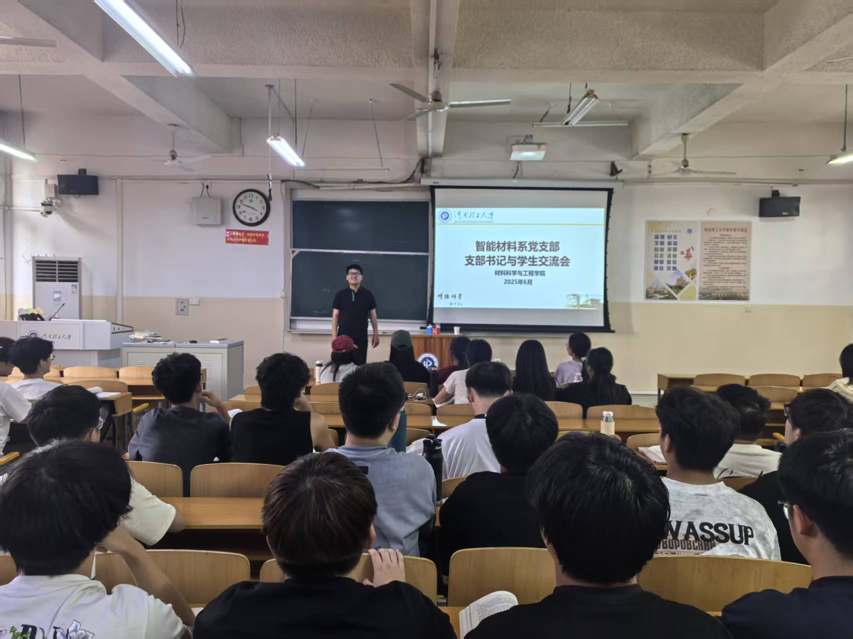 为深入学习贯彻习近平新时代中国特色社会主义思想,切实提升育人实效,进一步畅通师生沟通渠道,6月6日,智能材料系党支部在1号教学楼1204教室召开支部书记与智材23级学生座谈会。