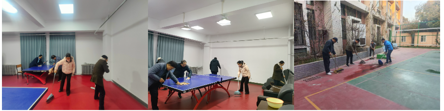 室外排球场地面散落着纸屑、树叶,球网边缘附着灰尘与蛛网;乒乓球室内球台表面有污渍,球拍、球网摆放杂乱。针对上述问题,党支部将志愿服务队分为2个小组,分别对接排球场地与乒乓球室。支部提前准备扫帚、拖把、抹布等工具,并明确各区域清洁标准——排球场地需实现地面无杂物、球网清洁平整,乒乓球室要达到球台光洁、物品摆放规范、角落无堆积的目标,确保清洁工作不留死角。经过清洁打扫,排球场地地面整洁如新,乒乓球室窗明几净,体育器材摆放有序,健身环境焕然一新。