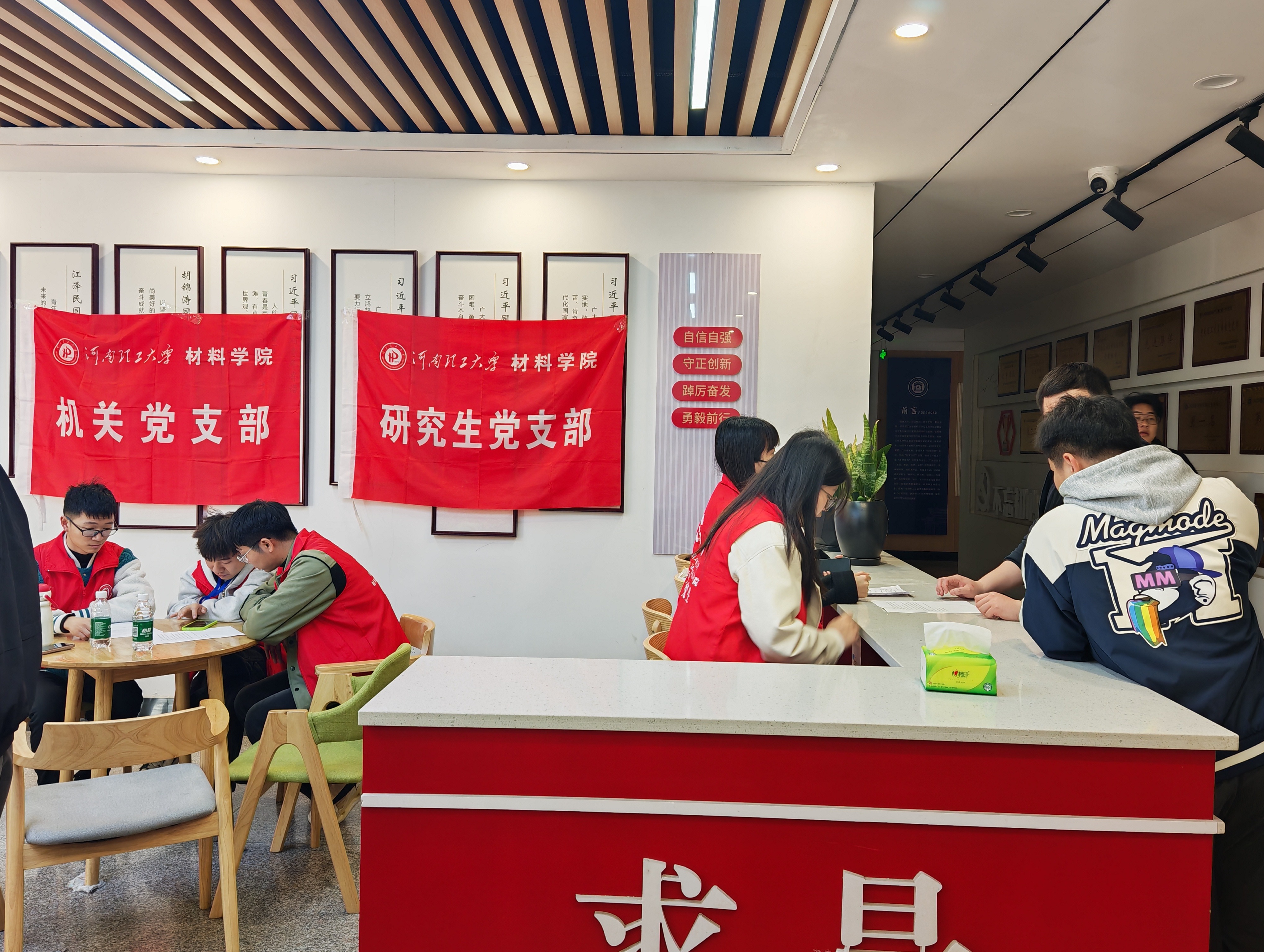 复试当天,活动现场秩序井然,党员志愿者们身着志愿服装,以饱满的热情、务实的作风投入到志愿服务工作中,全程坚守岗位、履职尽责。在复试报到区,志愿者们耐心接待每一位考生,细致讲解复试流程、注意事项及考场纪律,协助考生完成信息登记、资料提交等相关手续,用严谨细致的服务为复试工作筑牢基础;在候考区域,志愿者们主动为考生提供休息座椅、饮用水等物资,主动与考生沟通交流,用亲切的话语缓解考生的紧张情绪,为考生加油鼓劲,传递温暖与力量。